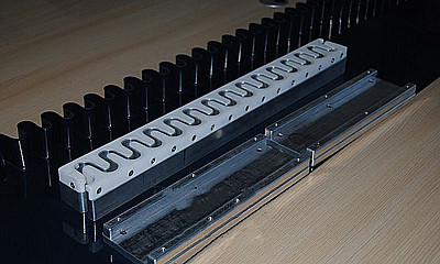 用于PVC,PET,或者含PVC30%以上PP等透明泡殼的折彎加工中,如有些酒瓶的包裝,一些吸塑片材的折彎,折彎模一般也分上模與下模。一般上下均呈V字型,下模有定位裝置。