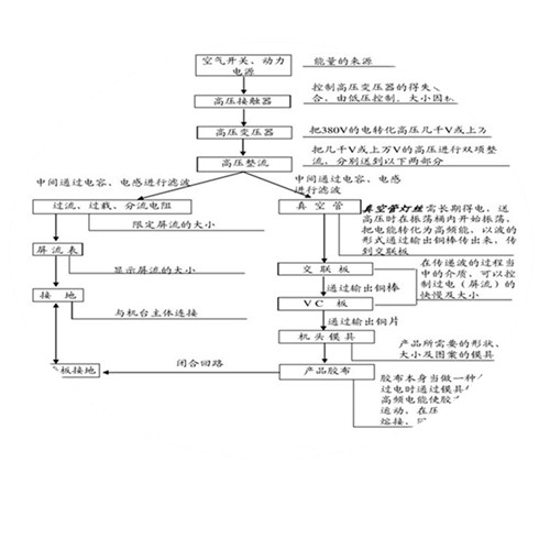 高周波把電源3相-380V電壓經(jīng)升壓整流轉(zhuǎn)換為直流高壓電壓,再經(jīng)高周震蕩置轉(zhuǎn)換高頻電壓,通過(guò)匹配裝置傳輸給壓機(jī),使壓機(jī)的上下電極構(gòu)成的工作電容器把高周電壓轉(zhuǎn)換成高周電磁場(chǎng)。